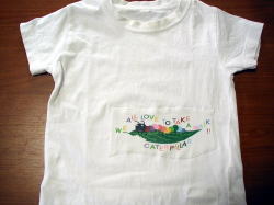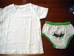 | ピカリの白いシャツ。 よく見えないけれどお腹のところに穴が開いて縫ってあります。 そこに小さくなったユウのパンツを縫い付けてしまいました。 |