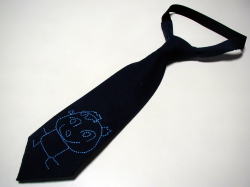 | パパが昔、水泳部を卒業するときに記念に渡したネクタイ。 後輩のママとママの先輩で選びました。 もちろん卒業生全員に渡したんだけど、パパのを選ぶときに「フジイさんは顔が濃い〜からやわらかく見えるものを・・・」と言っていたのを覚えています。 そのネクタイももうボロボロ。 あちこち擦り切れてもう使えません。 生地は使えないので芯を貰ってユウのネクタイを作りました。 ゴムをつけてかぶるタイプです。 刺繍はユウが描いた絵を縮小コピーしてバックステッチしたものです。 |