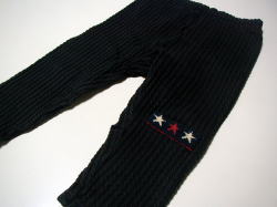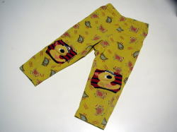 | よく転ぶピカリのスパッツに穴が開きました。 このスパッツも下のものと同じチーキーリーベリーです。 またもやチーキーリーベリーの穴あき靴下でワッペンを作って縫い付けました。 ビンボースパッツの出来上がり〜。 |